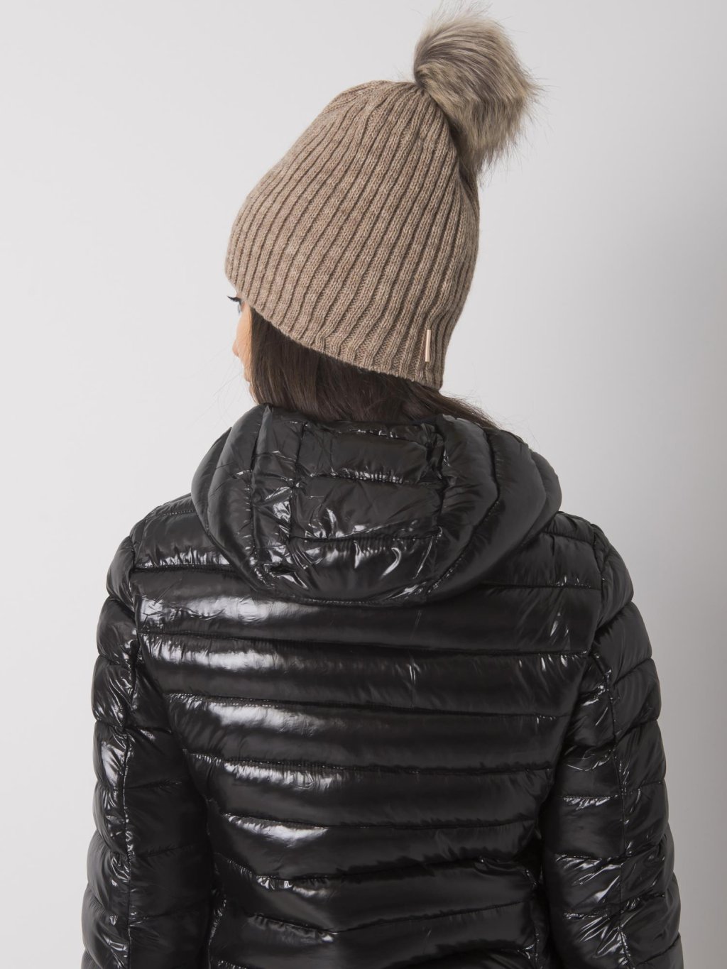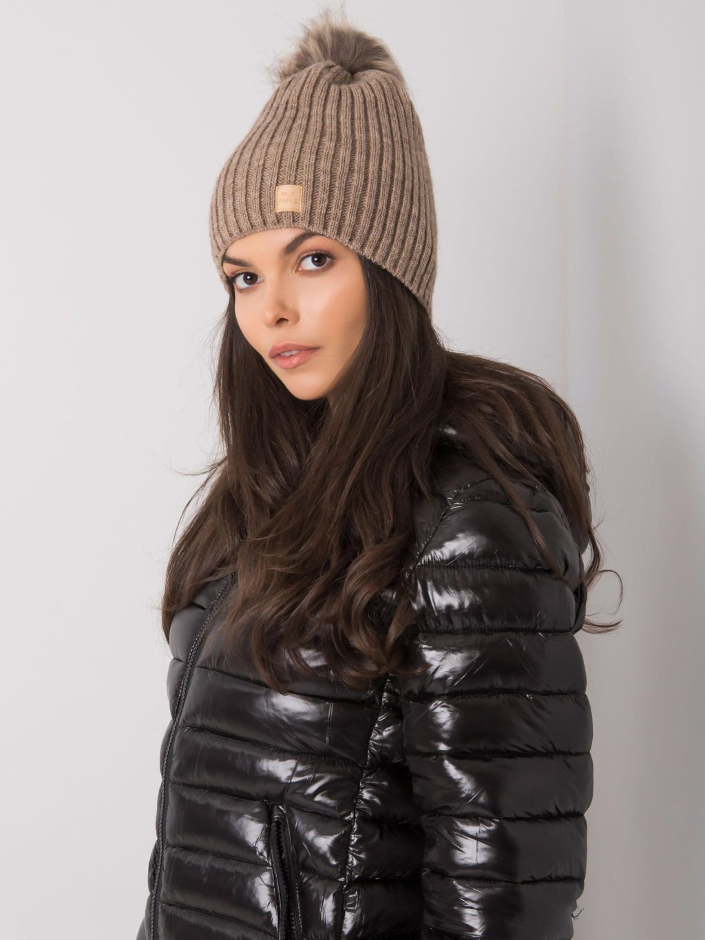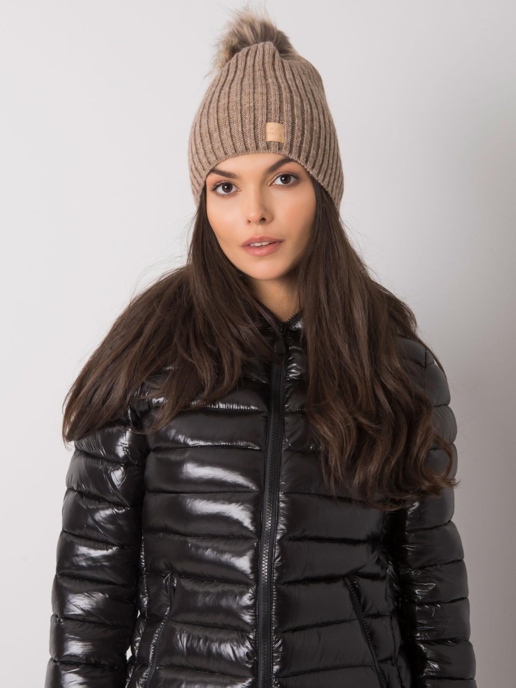 Sötét bézs sapka szőrme pompommal