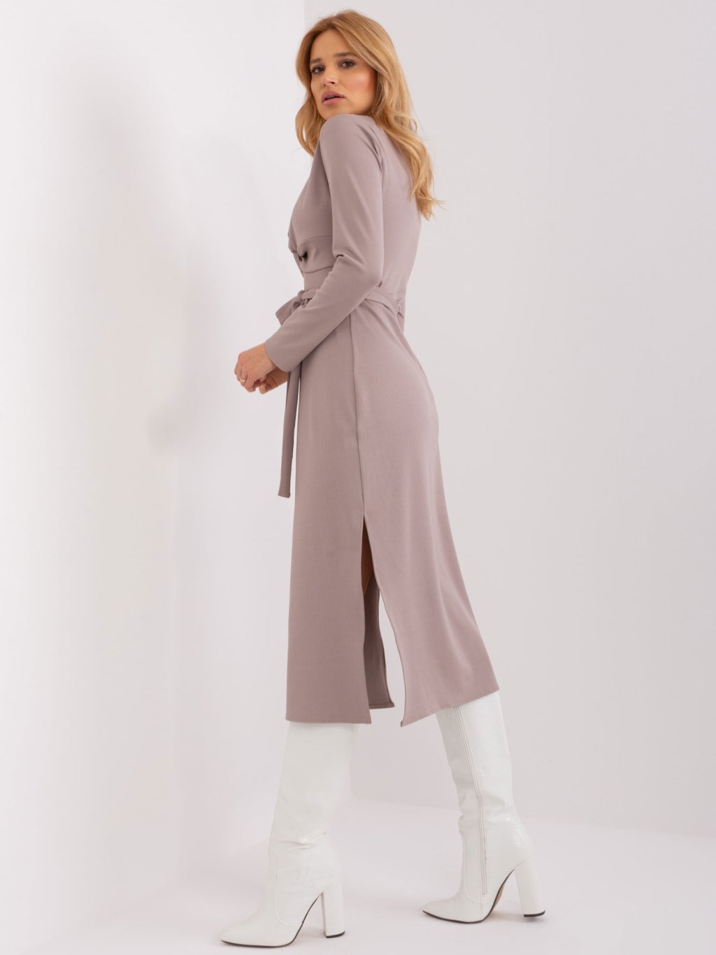 Sötétbézs midi ruha övvel