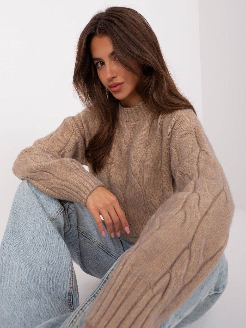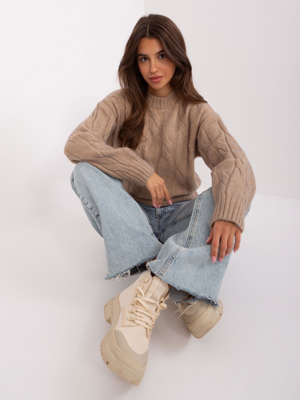 Sötétbézs pulóver fonat mintával