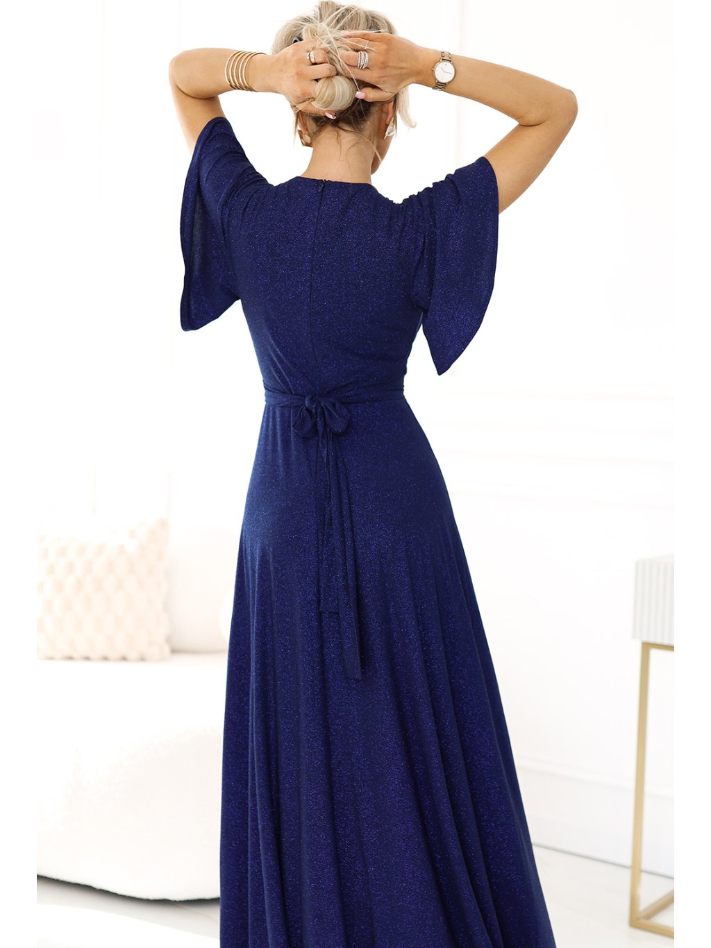 Sötétkék fényes hosszú ruha nyakkivágással JENNIFER