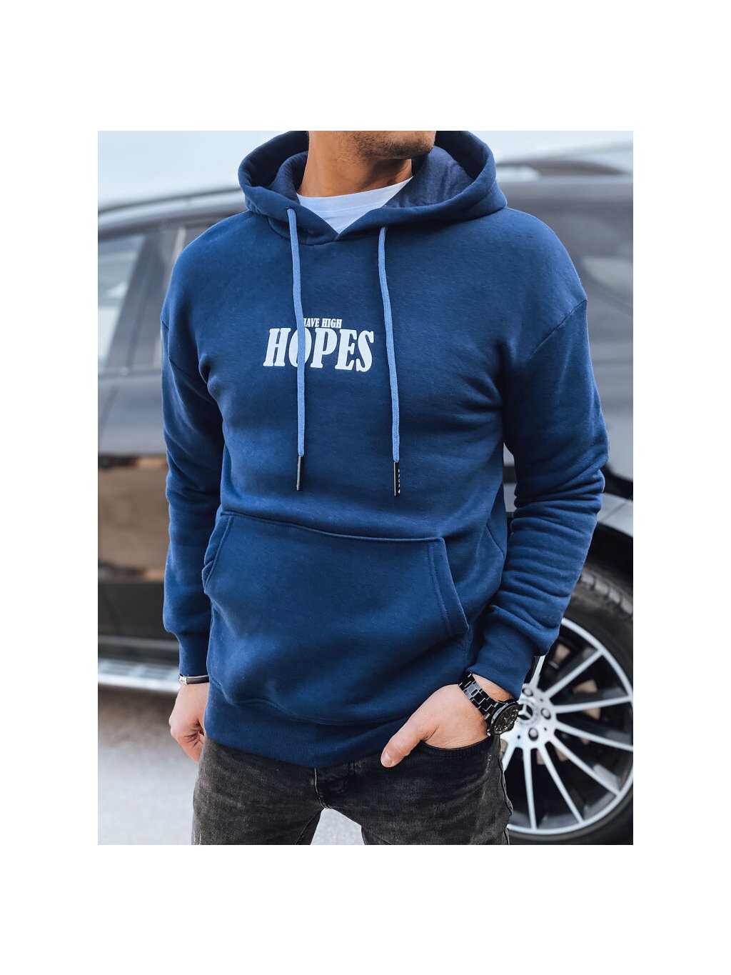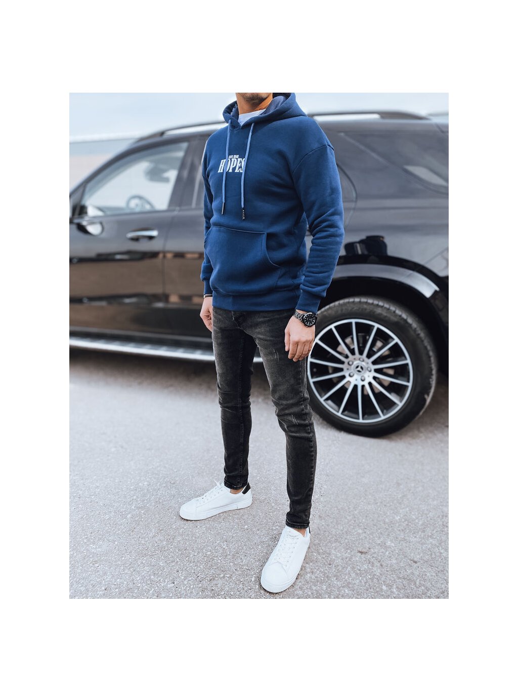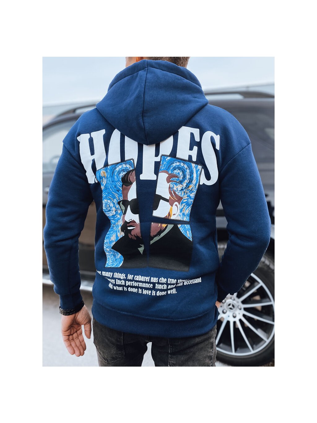 Sötétkék pulóver kapucnival és nyomtatással a hátán