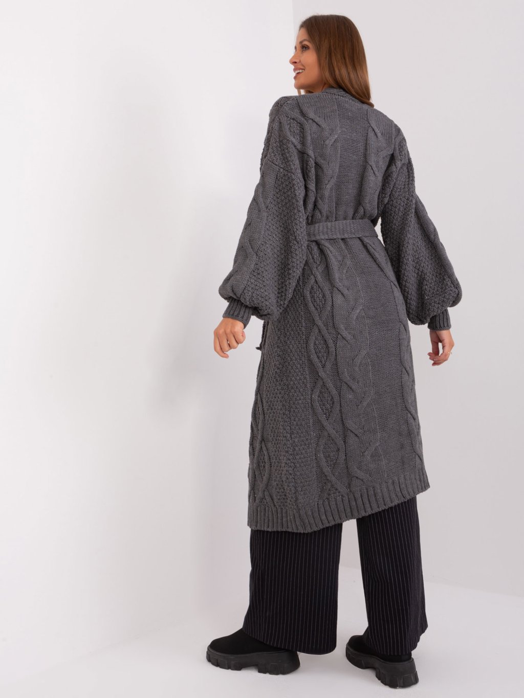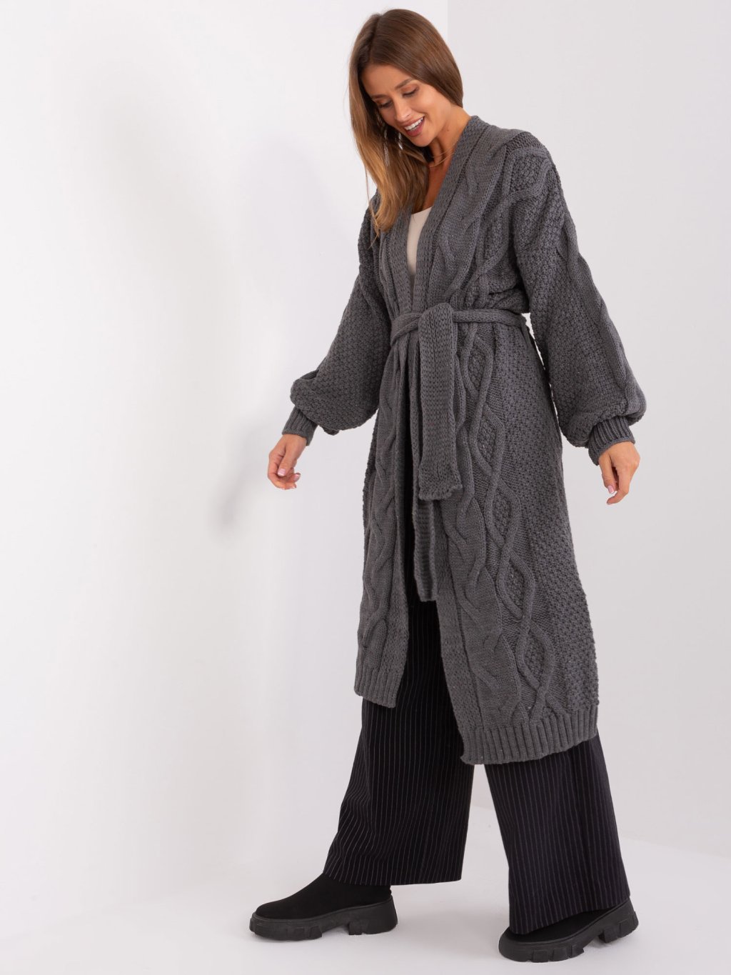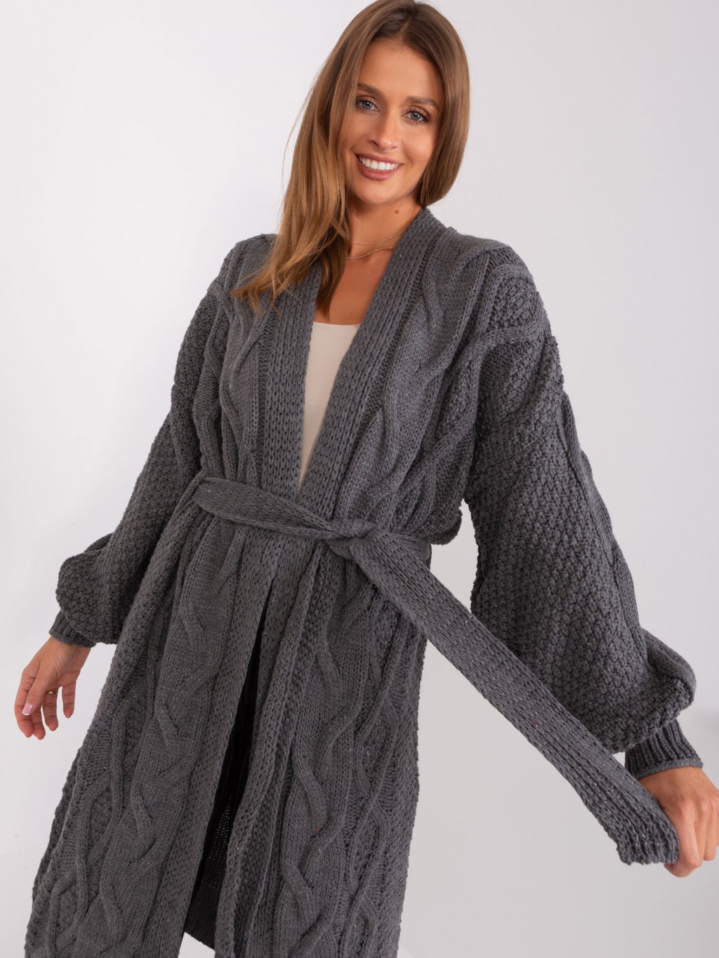 Sötétszürke hosszú kardigán övvel