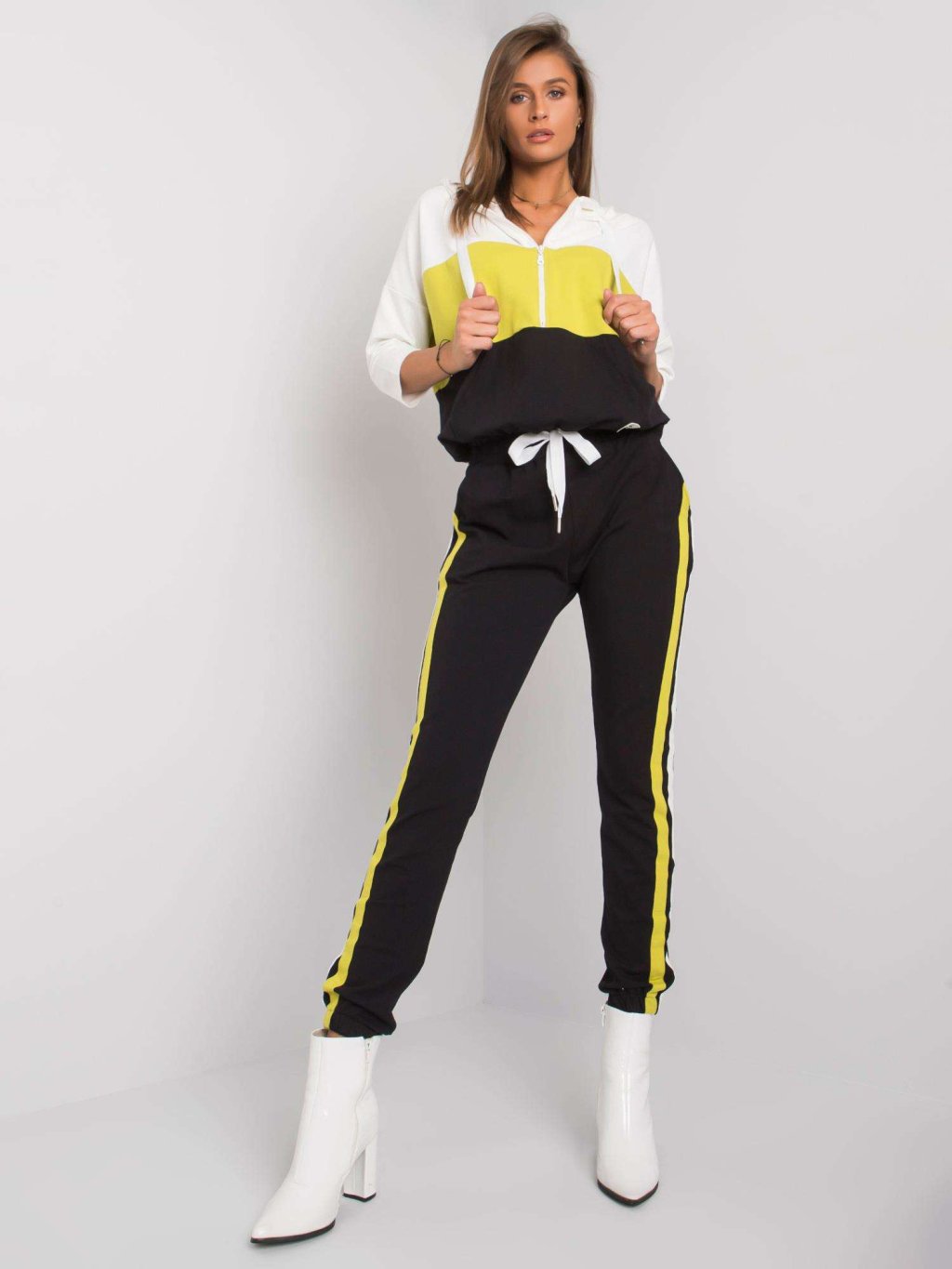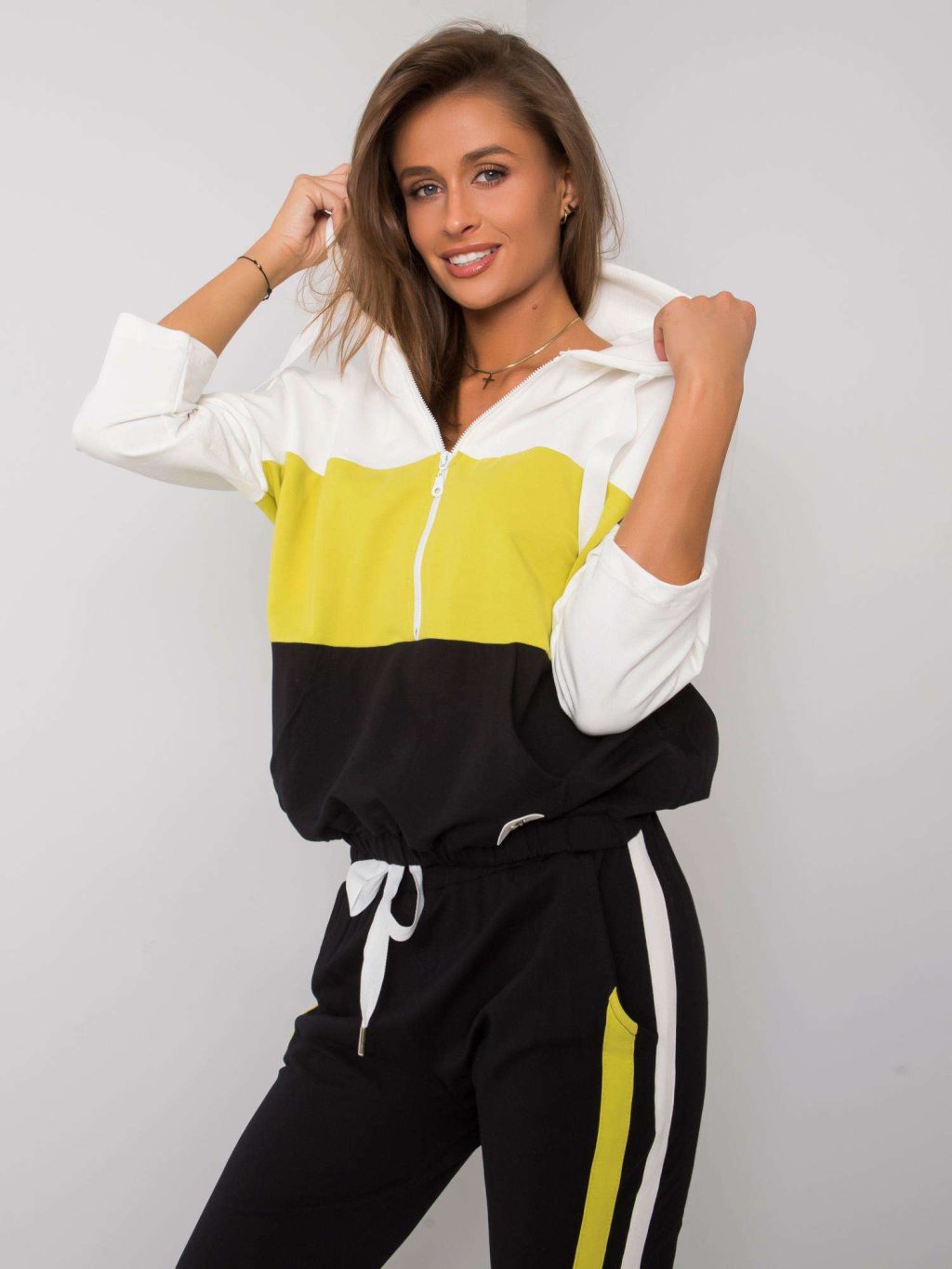 A készlet tartalmaz egy cipzáras pulóvert kapucnival és nadrágot.
