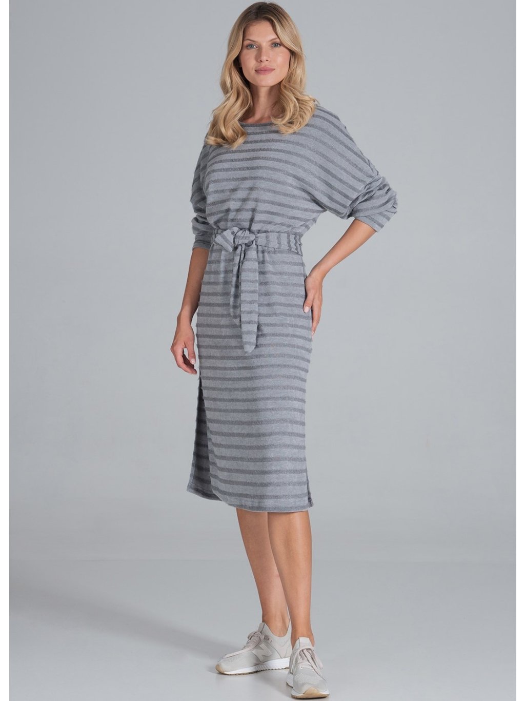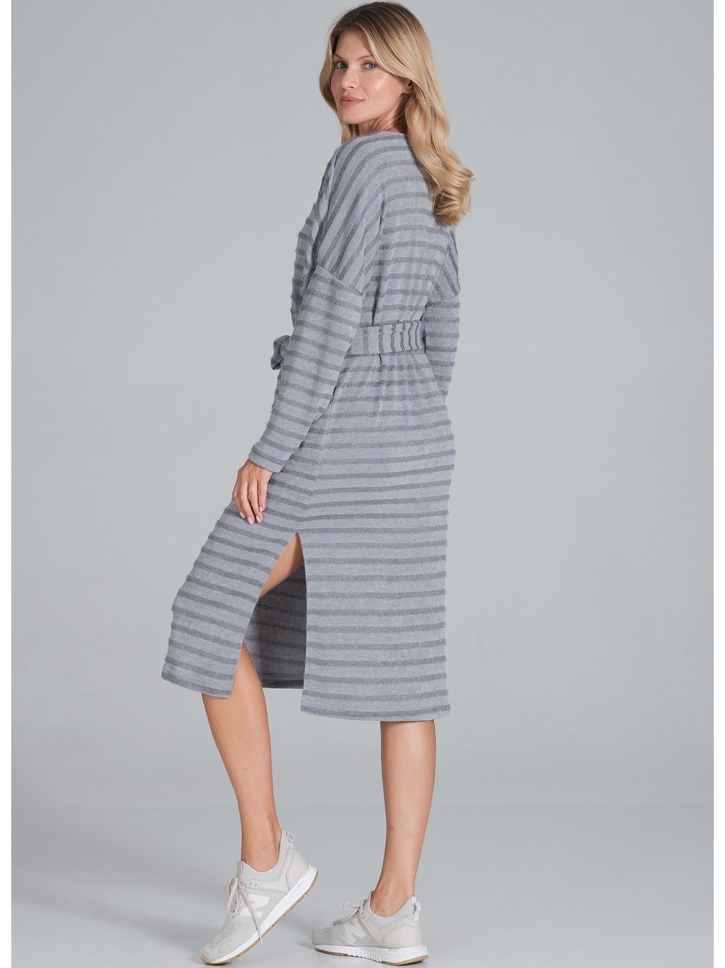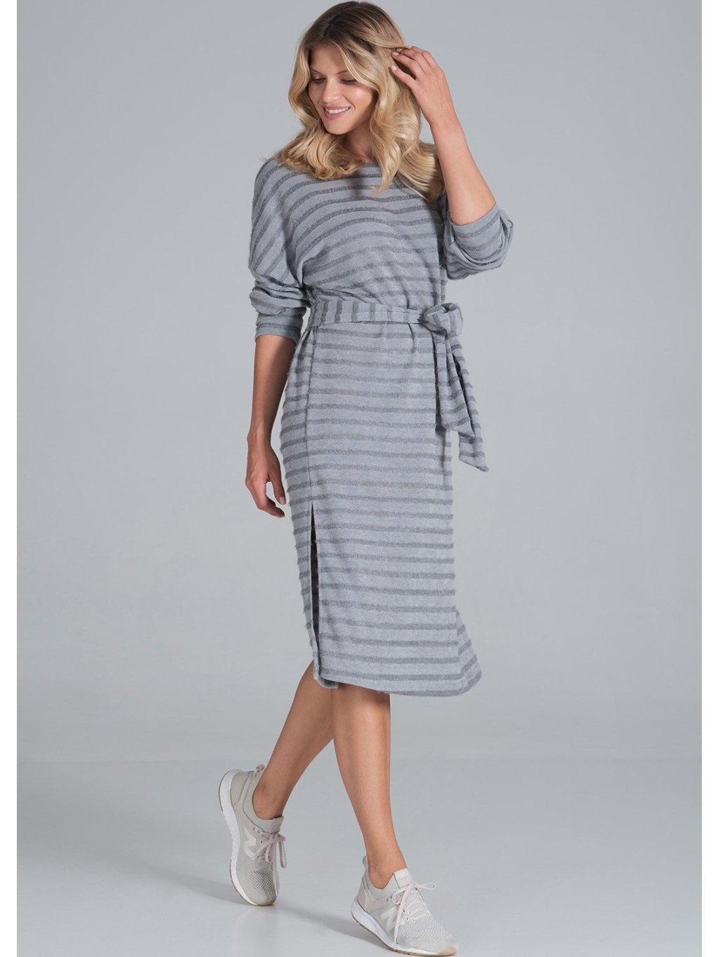 Szürke csíkos midiruha hosszú ujjakkal