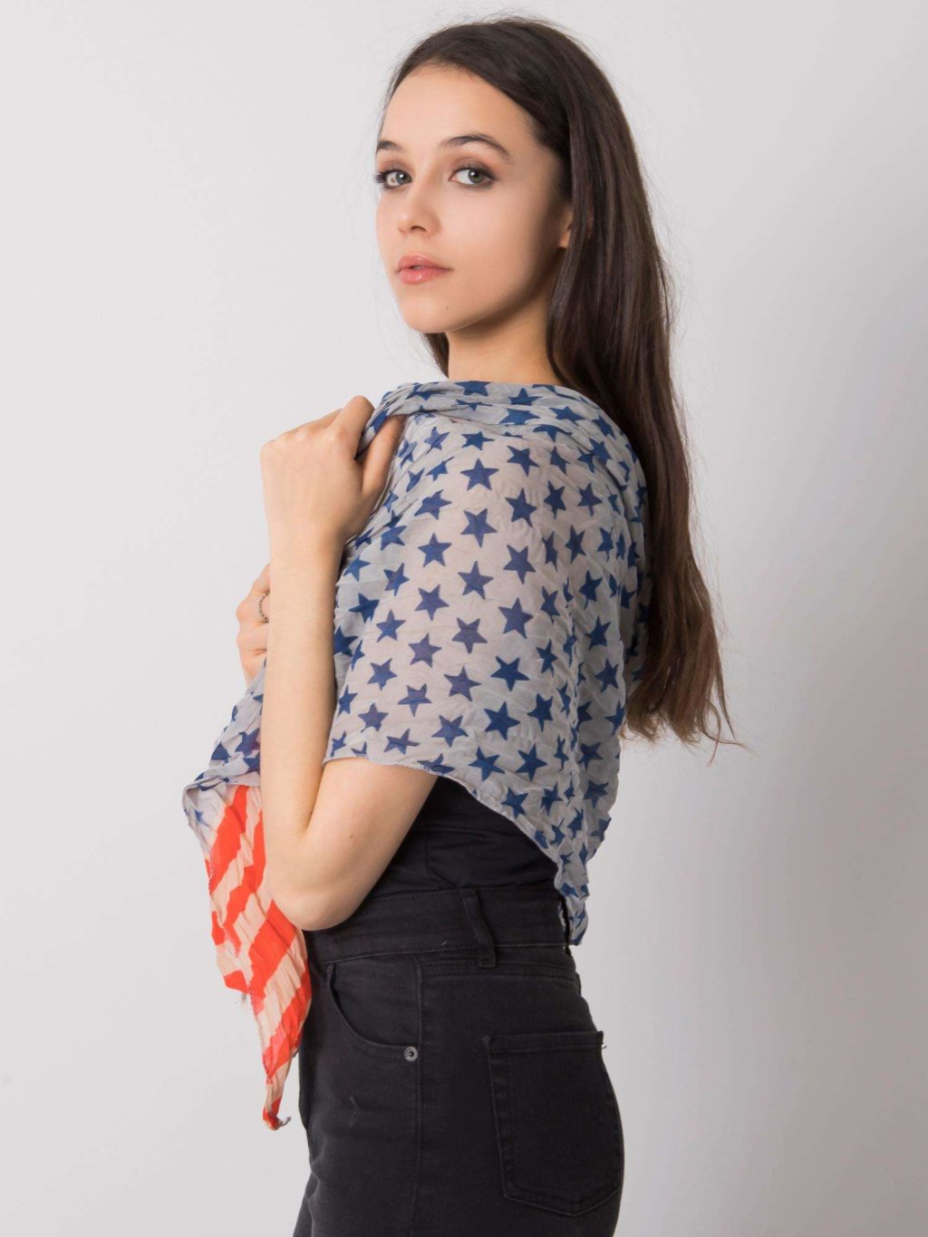 Szürke-piros kendő mintával