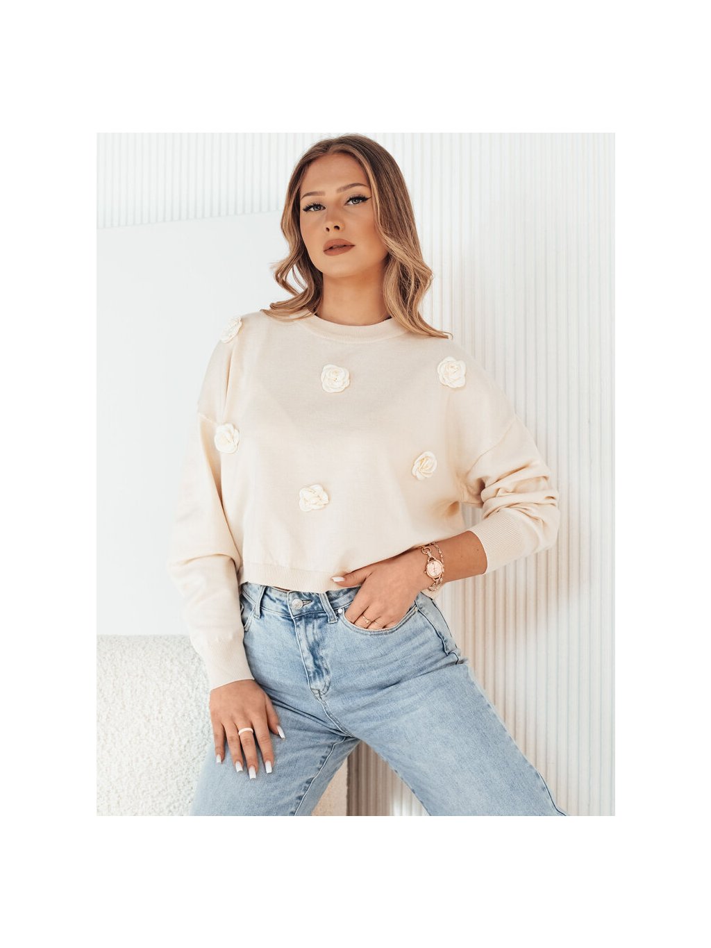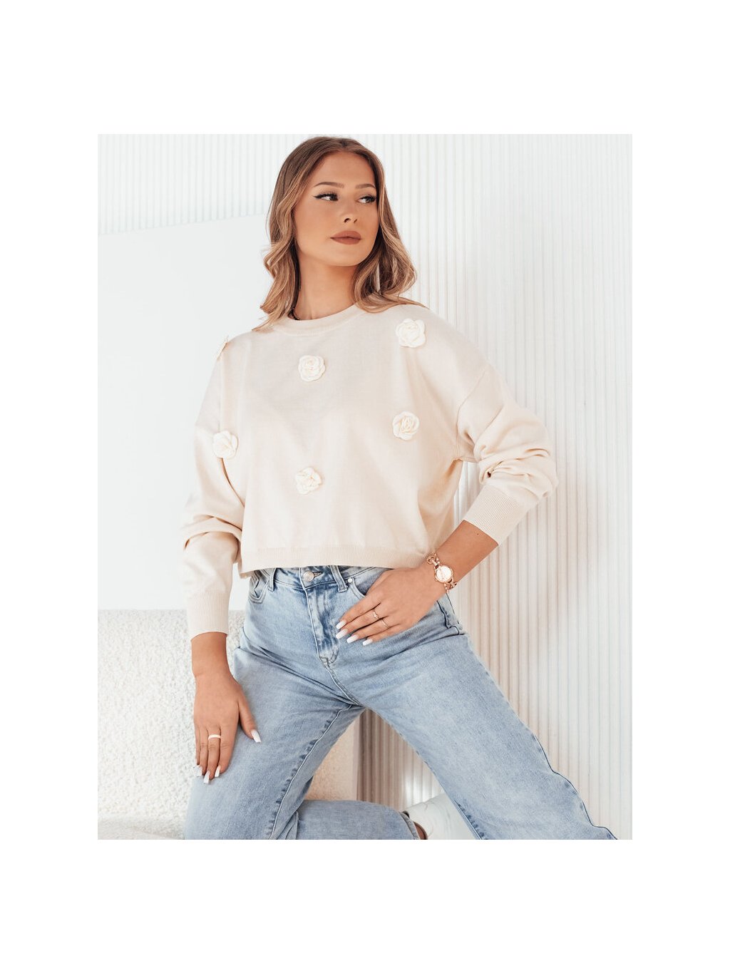 Világos bézs pulóver rózsa mintával COTNES