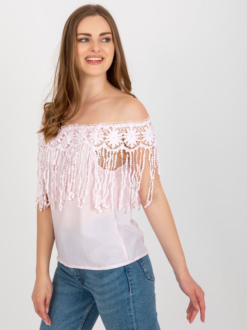 Világos rózsaszín blúz leeresztett ujjakkal és rojtokkal