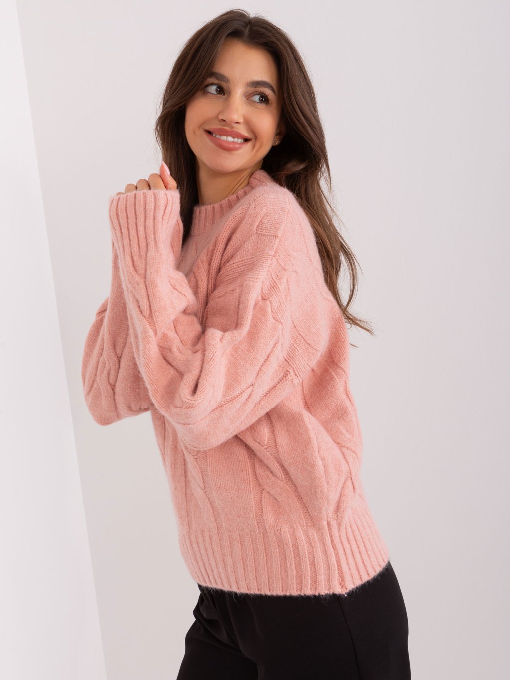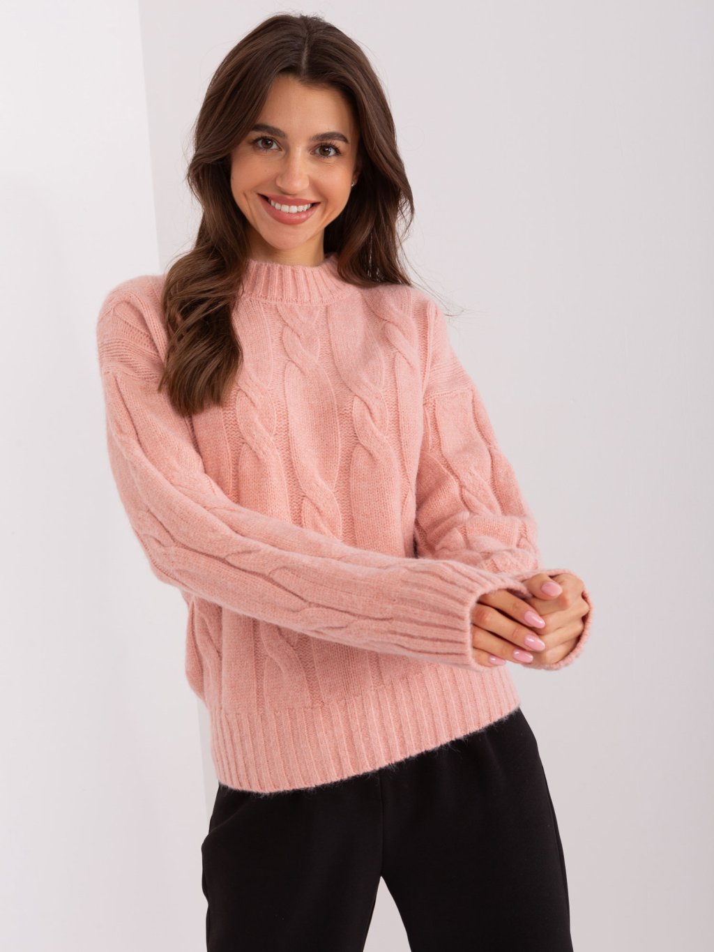 Világos rózsaszín pulóver fonat mintával
