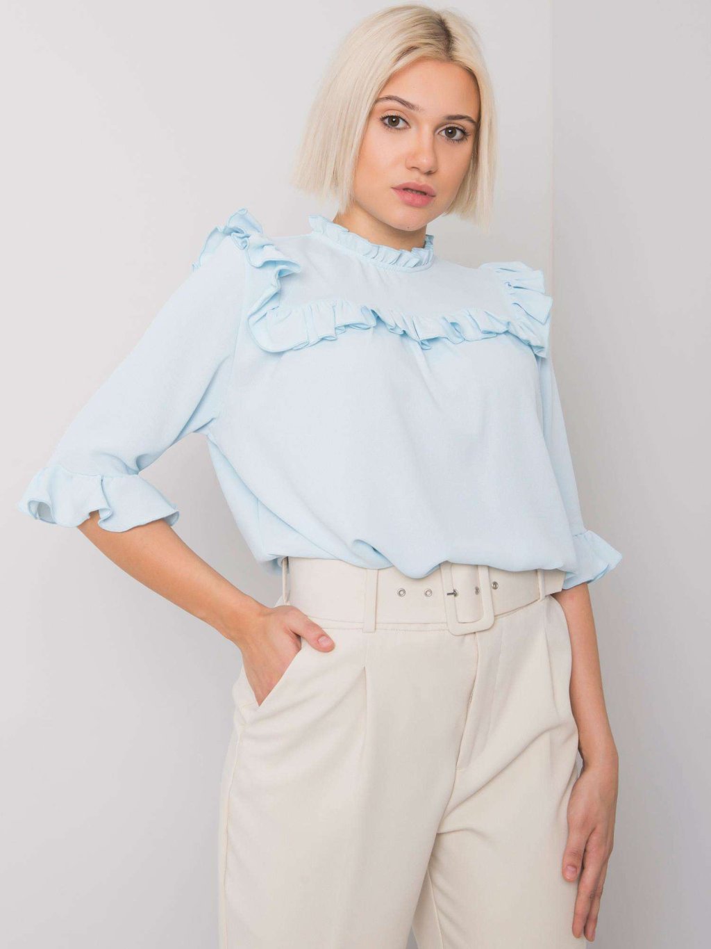 Világoskék női elegáns fodros blúz