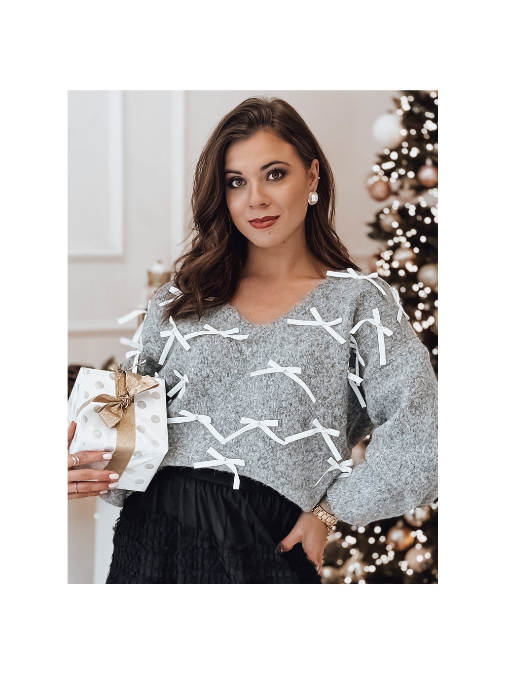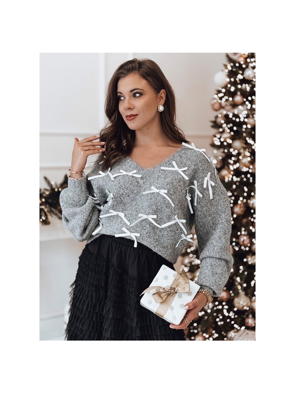 Világosszürke női pulóver masnival RIBBLOOM